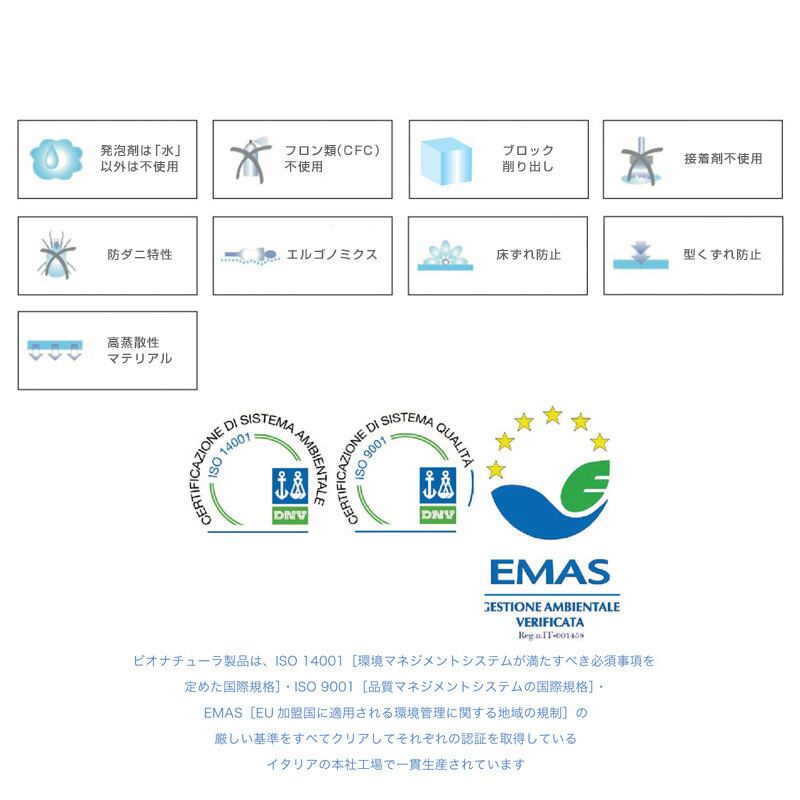 有害物質検査済み認証取得[OEKO TEX STANDARD 100]・欧州屈指の研究機関との共同研究[Padua and Lecce University]・空気透過性能認証取得[UNI EN ISO 4638]・清涼感維持性能検査済み[University of Padua]などによる耐久性に優れさわやかな使い心地の健康的で安全・安心な製品です。